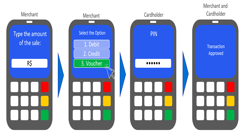 - Voucher: Para pagamentos em restaurantes, mercados e benefícios de cultura, basta escolher a opção “Voucher” na maquininha ou nos apps e sites.
